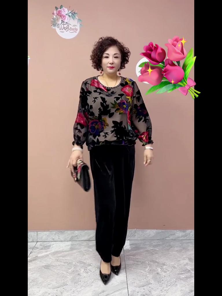 Spring and Autumn Women's Plus-Size Blouse Loose Fit Printed Silk Blouse Round Neck Floral Velvet Blouse