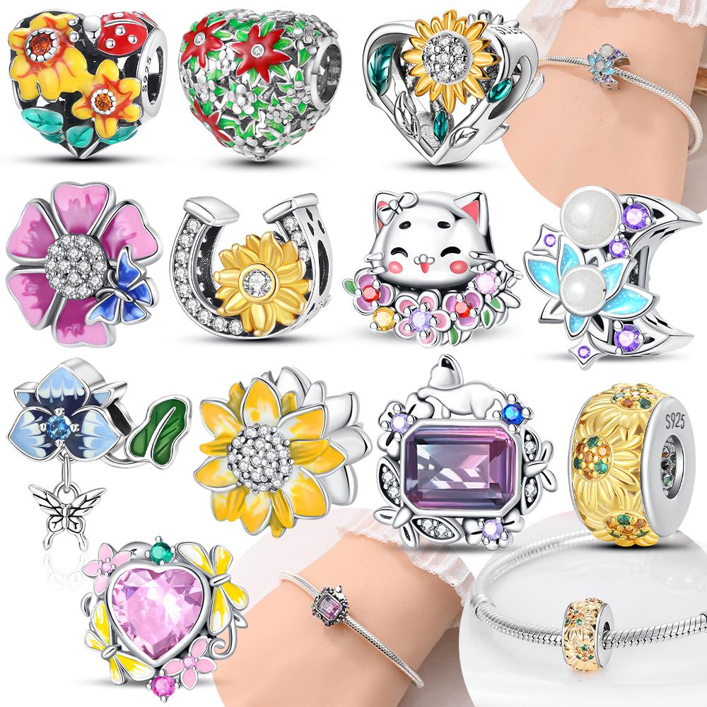 Original Copper Pink Heart Zircon Flowers Cats Sunflowers Beaded Charm Fit Bracelet Women Gift Diy Jewelry Set