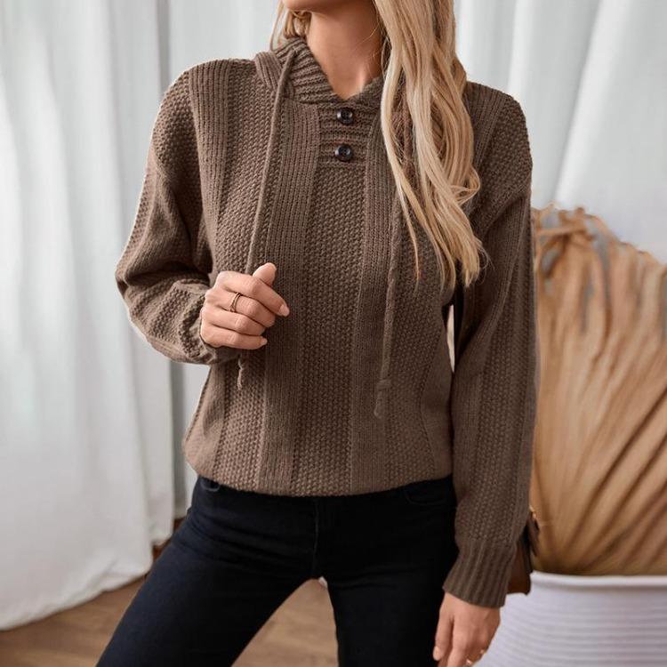 Vintage Pullover Sweater Hooded Loose Long Sleeve V-Neck Solid Color Knitwear Top for Autumn Winter