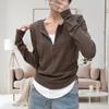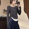 Burgundy fake two-piece half-zipper T-shirt women's spring waist pleated long-sleeved top design bottoming shirt