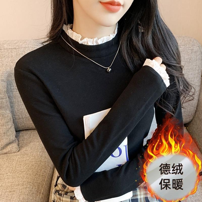 German velvet thermal bottoming shirt women's lace semi-turtleneck top spring temperament long-sleeved T-shirt