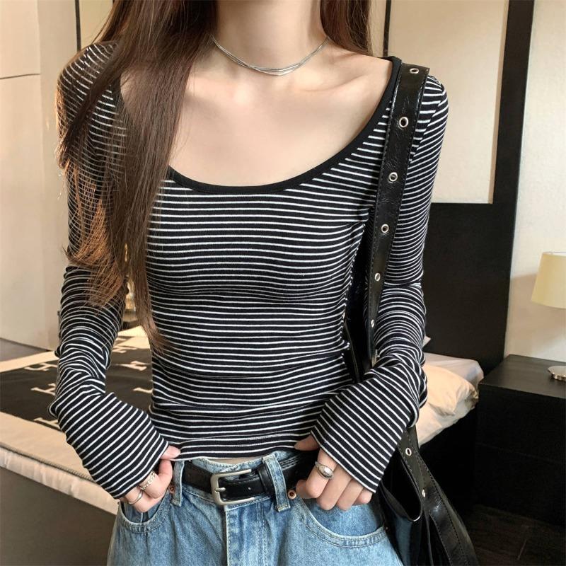 Spring sexy babes big neckline striped contrasting top women's bottoming shirt slim and thin long-sleeved shirt tide