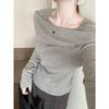 High-end gray one-word shoulder long-sleeved women's top spring new slim-fitting and thin shirt versatile bottoming shirt