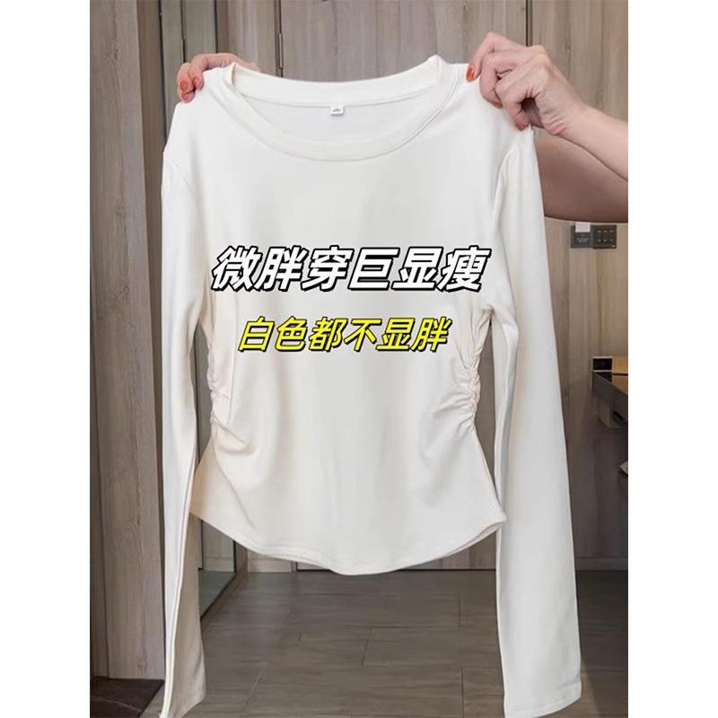 Crew neck front shoulder bottoming shirt women's waist pleated top spring irregular inner design long-sleeved shirt