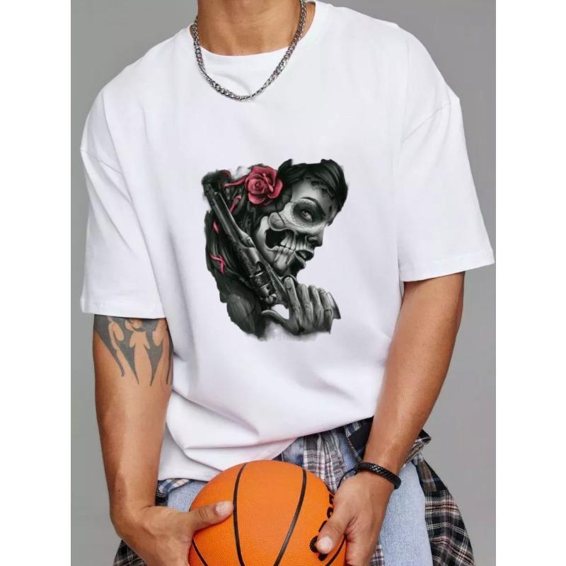Bílé tričko s designem lebky a růže pro běžné nošení
