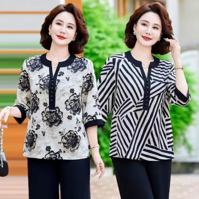 Summer Fragmented V Neck Middle Aged Elderly Mom's Shirt Noble Temperament Enlarged Loose Fit Shirt
