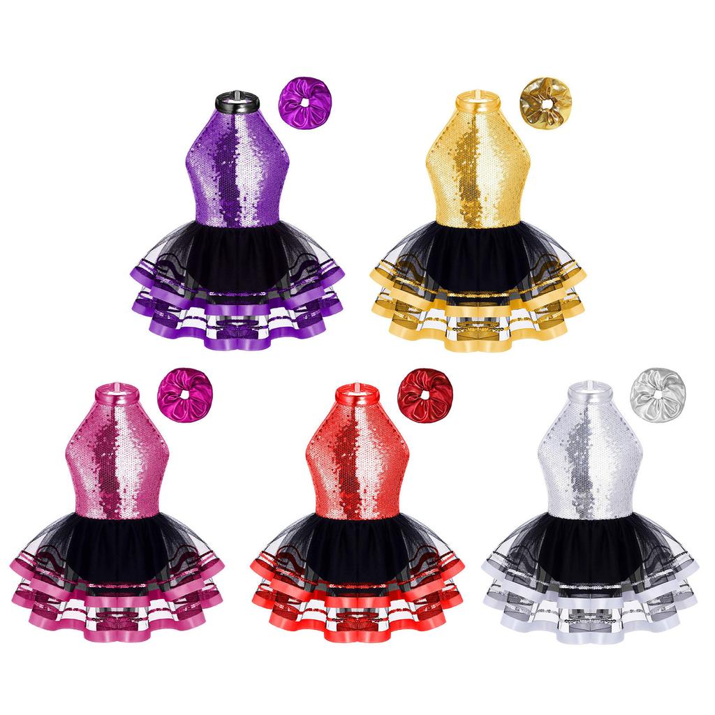 Dívčí halterové bez rukávů bez zad třpytivé flitry zdobené tutu taneční šaty vystoupení kostým metalické gumičky do vlasů set