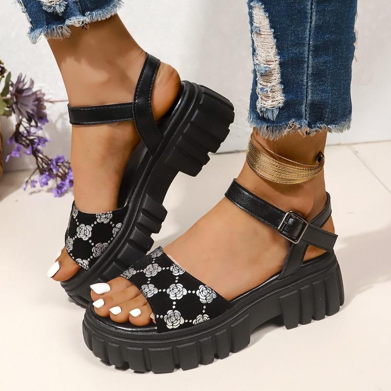 Women's Platform Sandals with Block Heel and Waterproof Platform Sandals with Fashion Pattern One-line Buckle