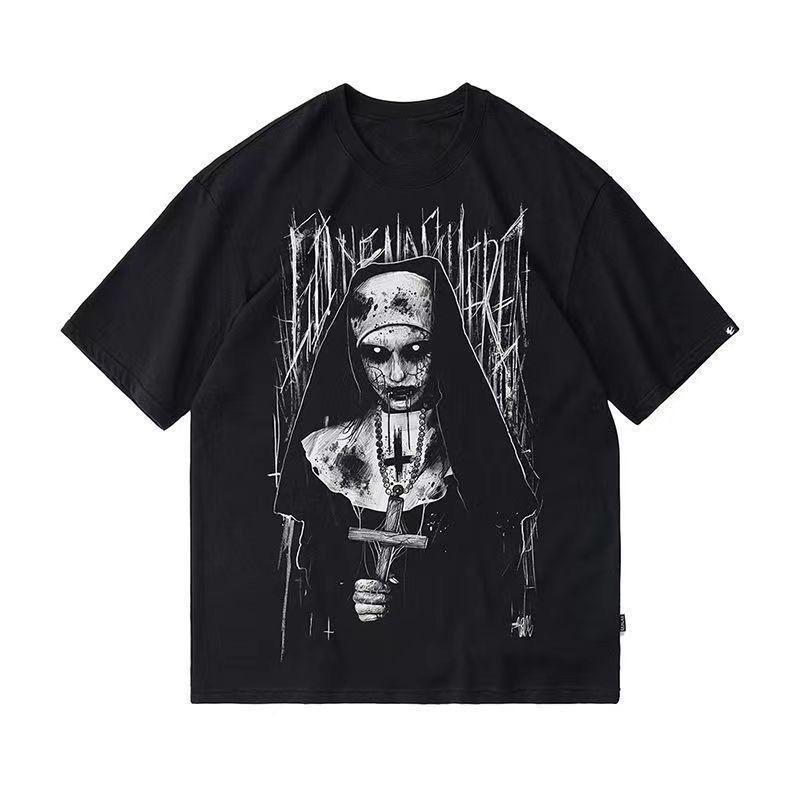 Dark Gothic Rock Short Sleeve T-shirt Horror Pattern Print Short Sleeve Niche Dark Retro High Street Loose Top for Men and Women