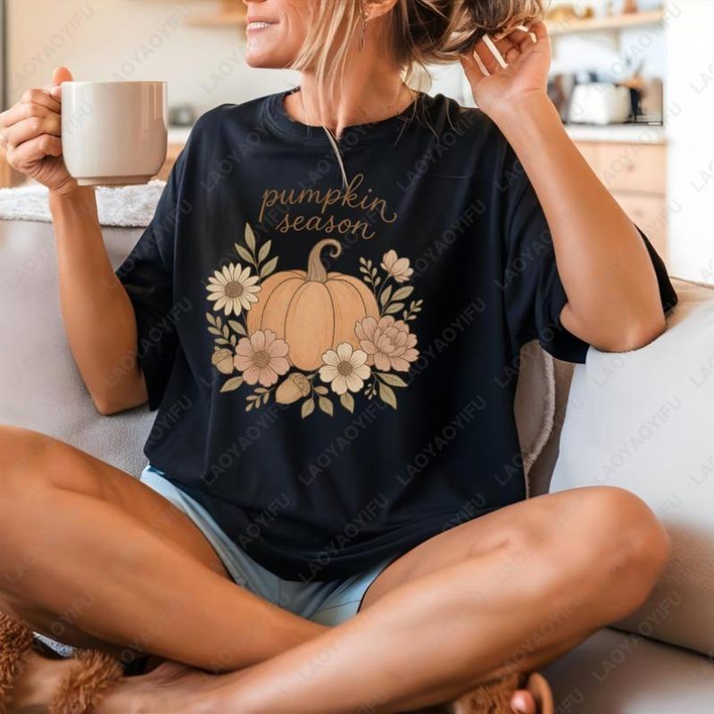 Pumpkin Season Cotton TShirt Fall Floral for Women Men Cute Thanksgiving Autumn Season Tops Cozy Outfit Popular Harajuku Tees