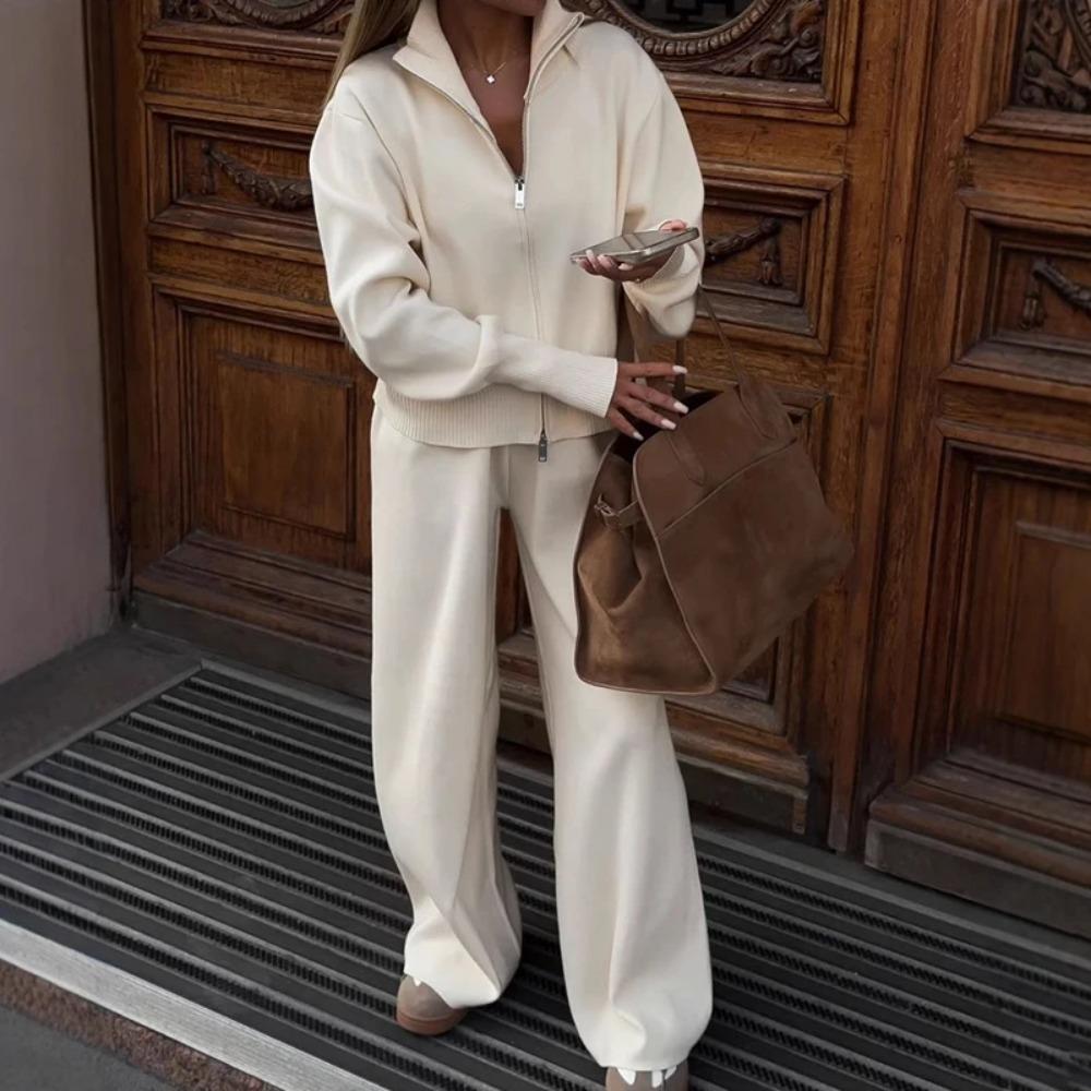 Lady Solid Tracksuit Casual Knitted Cardigan Pants Sets 2 Pieces for Women Stand Collar Zipper Coat Wide Leg Pants