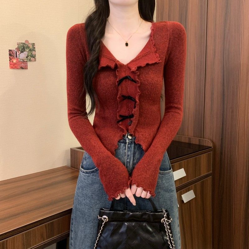 Solid Color V-neck Knitted Bottoming Shirt for Women Autumn New Slim Fit Short Long-sleeved Sweater Top