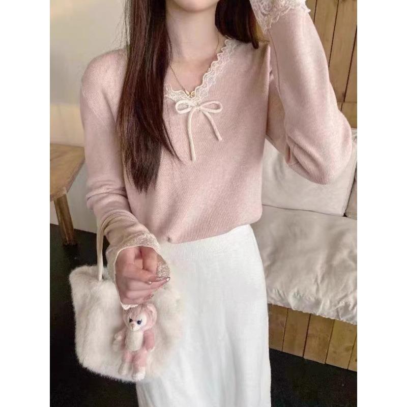 Pink bow-tied bottoming shirt top women's winter inner lace collar design knitted sweater