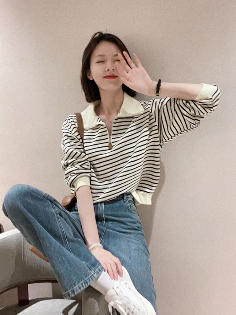 Striped sweater spring new women's sweater bottoming shirt design olo lapel loose and thin