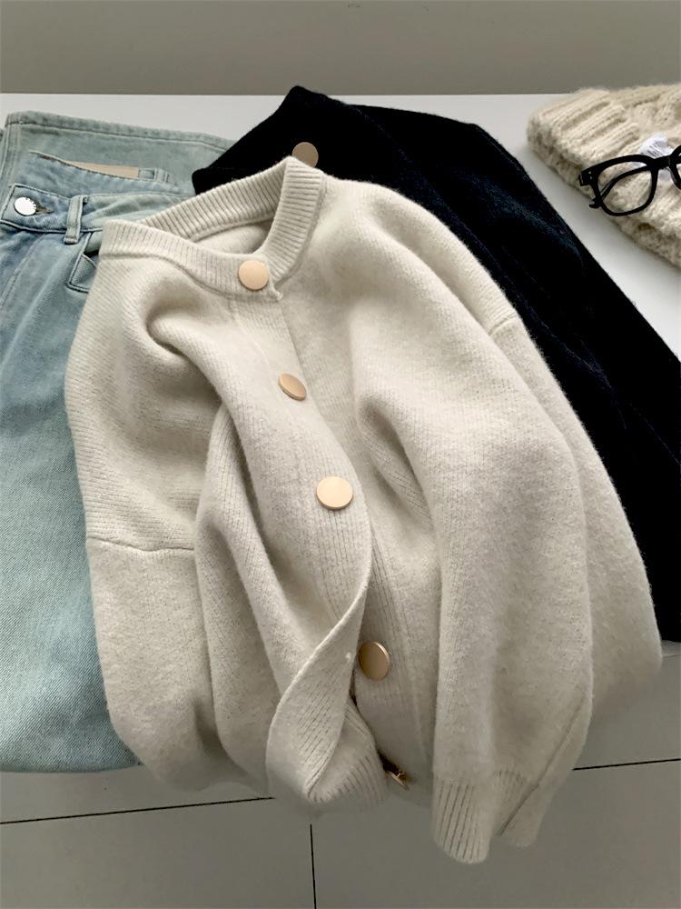 Stacked retro age-reducing long-sleeved knitted sweater autumn and winter single-breasted outer sweater lazy top cardigan women