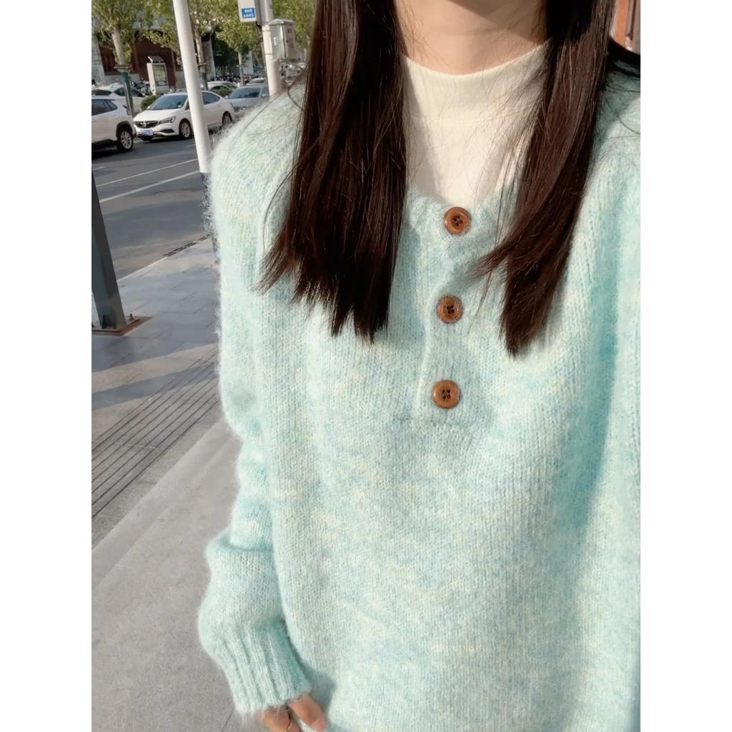 Macaron Thickened Sweater Women's Retro Autumn and Winter Lazy Wind Henry Neck Pullover Button Long Sleeve Knitted Top