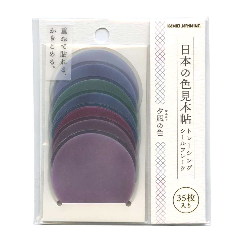 These flake stickers are from the popular "Japanese Color Sample Book" series, featuring beautiful Japanese color names. These 45mm round, writable stickers can be used for a wide range of purposes, from decorations to planners. The translucent tracing sticker paper allows you to enjoy the changing colors by layering them. Contents: 35 sheets (7 designs x 5 sheets). Size: 45mm height x 45mm width. Product color: Purple. Cover pattern: Solid color.