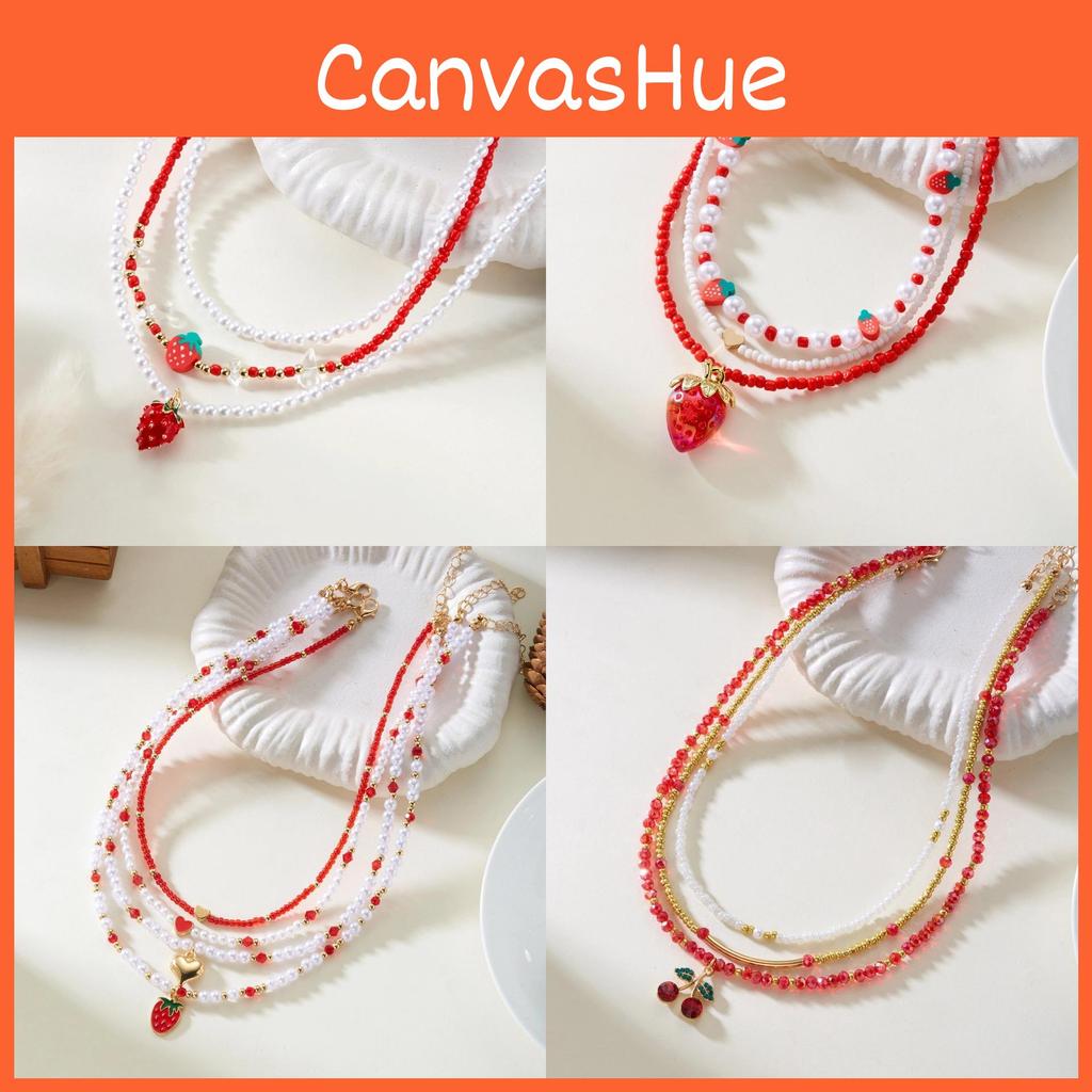 Summer Strawberry Fruit Pendant Necklace Set With Pearl Layered Choker For Women