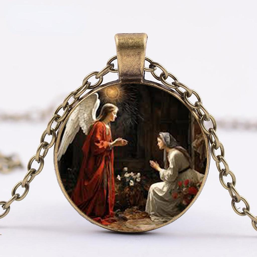 Christian Glass Dome Pendant Necklace with Vintage Angel Wings, Unisex Design for Good Luck