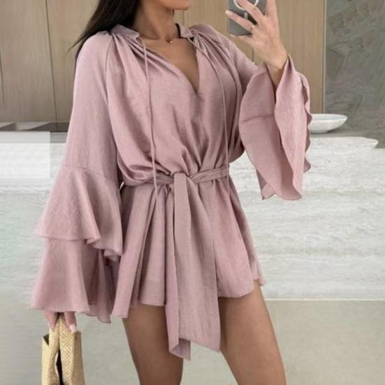 Letní volánkové šaty s dlouhým rukávem pro ženy ležérní V-výstřih áčkového střihu swingové minišaty s páskem nepravidelné prázdninové šaty