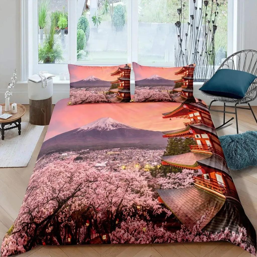 Japan Mount Fuji Duvet Cover Set Cherry Comforter Cover Retro Tower Bedding Set Japanese Ukiyo-E Bedspread Cover Full Queen Size