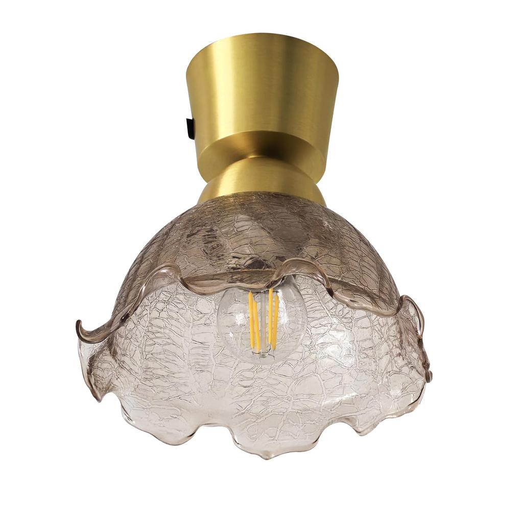 Stylish, compact, semicircular glass ceiling light with a brown, cracked-look shade, brass socket, E26 base, LED compatible, perfect for living