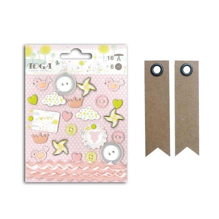 22 embellissements Naissance fille rose + 20 étiquettes kraft Fanion