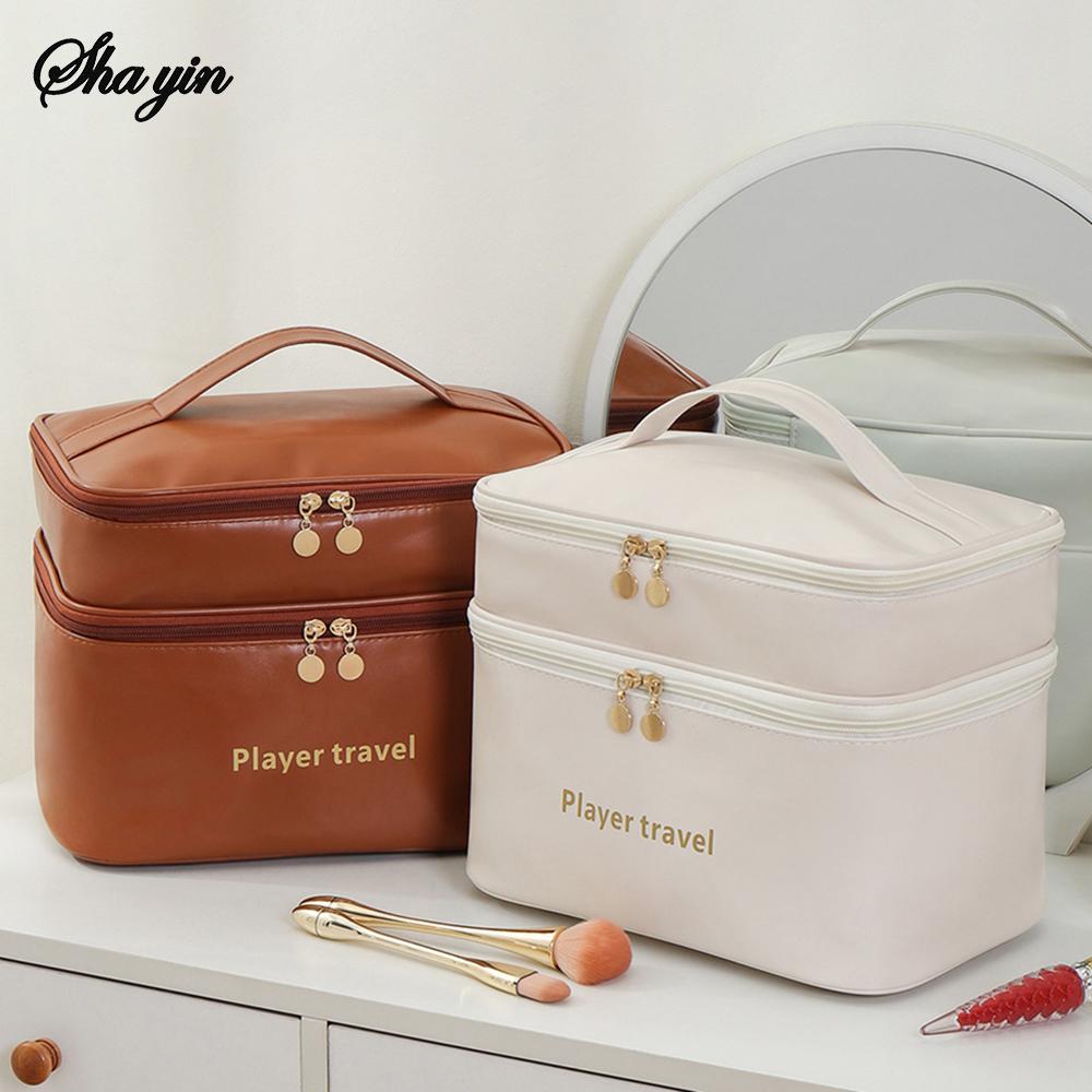 Light Luxury Fashion PU Double-Layer Makeup Bag Travel Large Capacity Toiletry Skincare Storage Bag Essential Travel Accessories