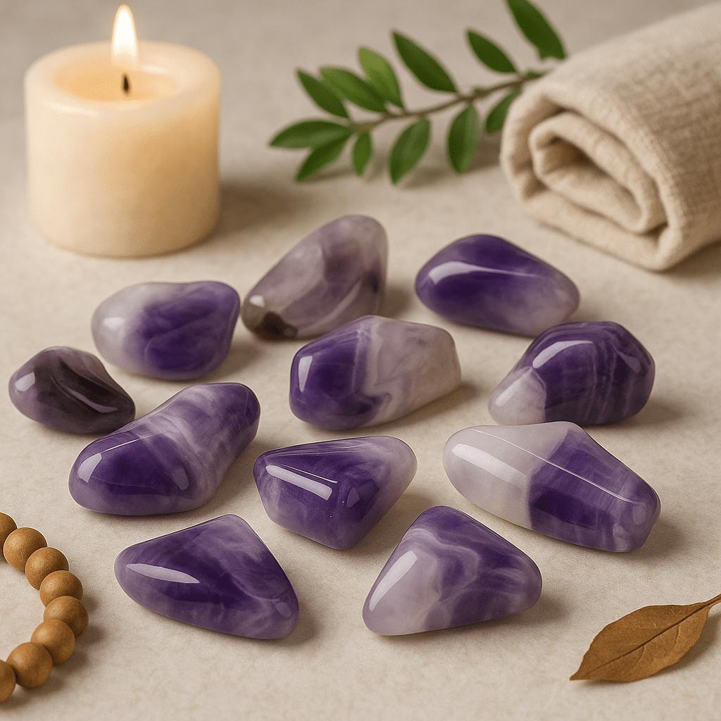 Each stone is unique in pattern and shape, softly rounded and easy to hold. Some show distinct zigzag bands; others swirl from deep violet to pale lavender with semi-translucent layers. Keep one in your pocket, rest a few by your bedside or on a meditation altar, weave them into simple rituals or grids, or share as a thoughtful gift that speaks without words.