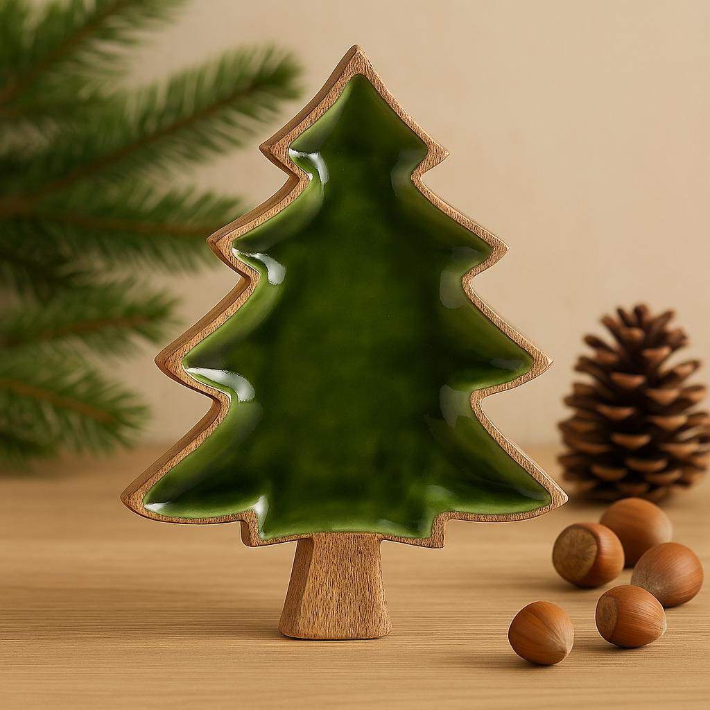 Mango Wood Christmas Tree Bowl Green Enamel 25x19cm