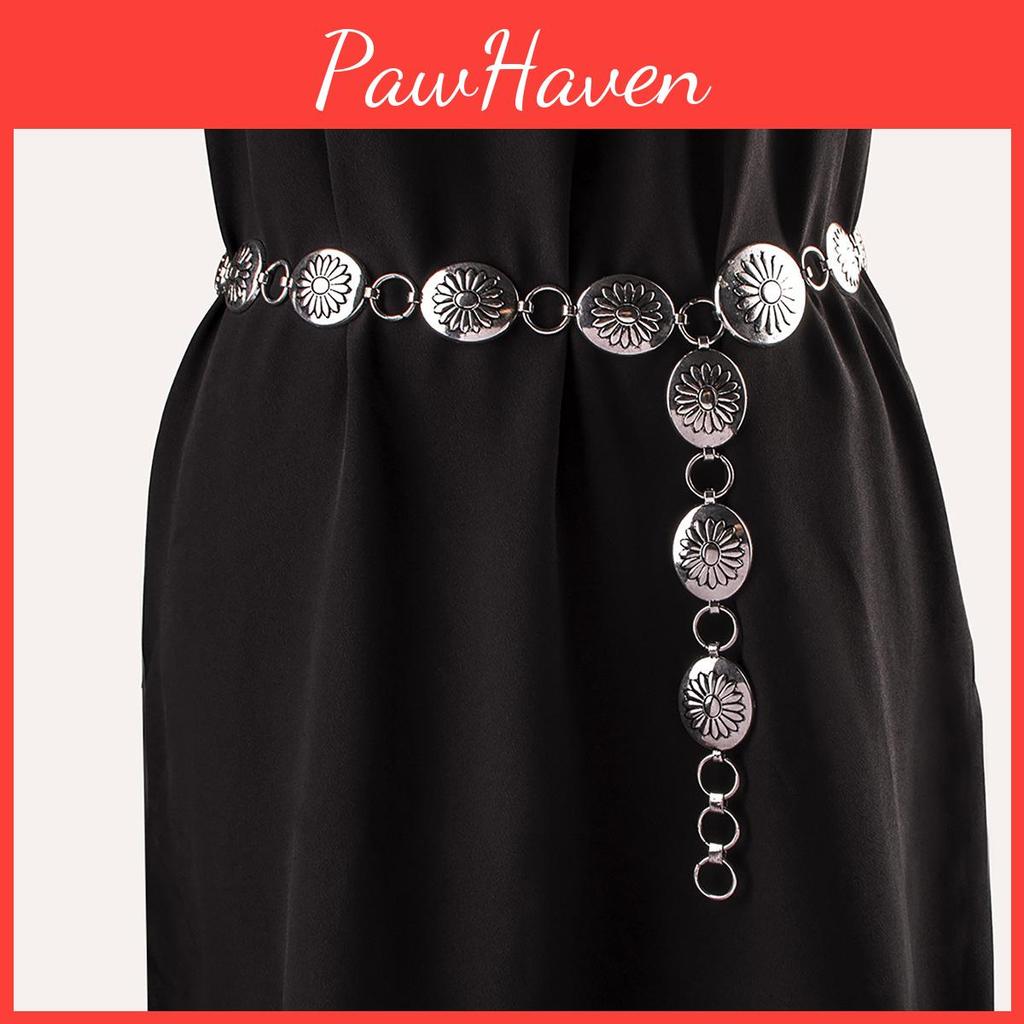This fashion waist belt features a metal alloy construction, measuring 107cm in length. Its elegant floral engravings and geometric design add a vintage-inspired touch, ideal for enhancing casual or dressy outfits. The belt's standard width of 2-4cm provides a versatile fit. Suitable for summer wear, it complements bohemian or artistic styles. Wipe clean with a soft cloth to maintain its appearance.