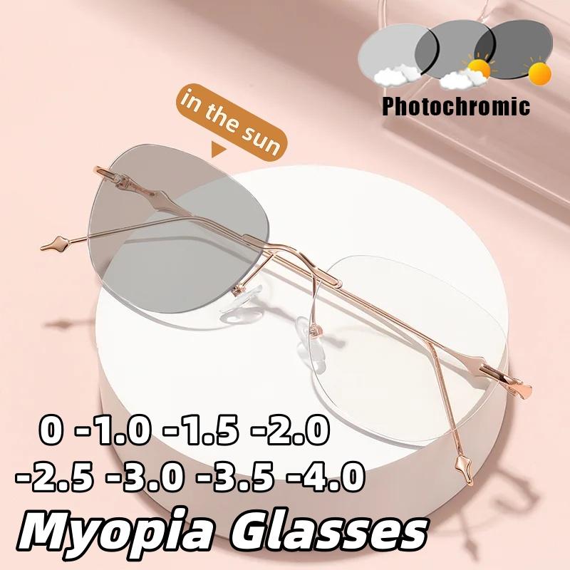 Metal Frameless Photochromic Anti-Blue Light Myopia Glasses Unisex High-Definition Comfort Eyewear Minus Diopter 0 To -4.0