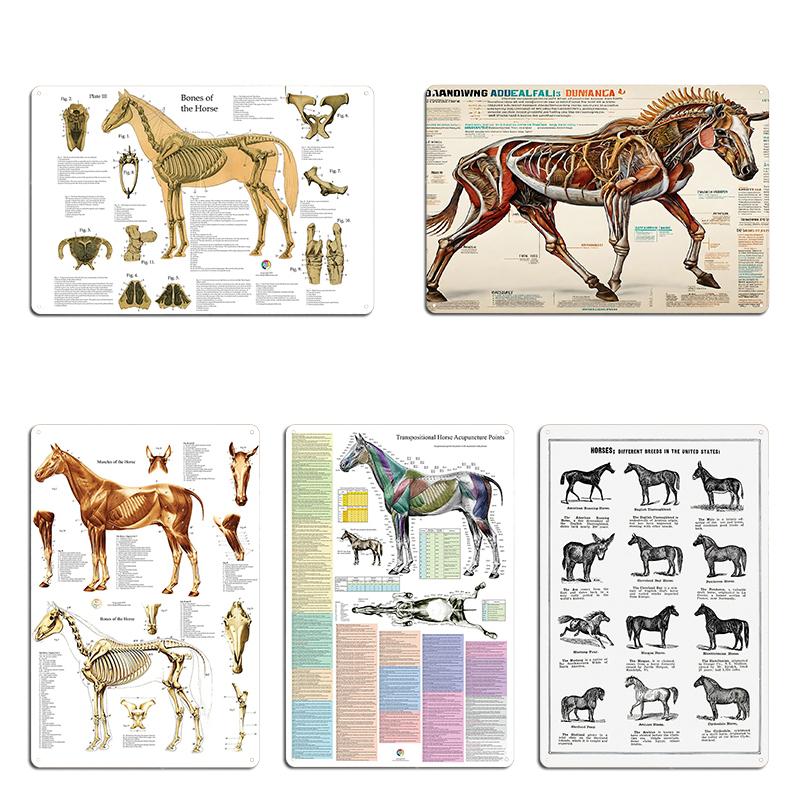 Koňská kosterní anatomie Veterinární nástěnný plakát Průvodce anatomií Kovová deska Dekorace stěny obývacího pokoje nebo hospody Železný plechový znak Plakát