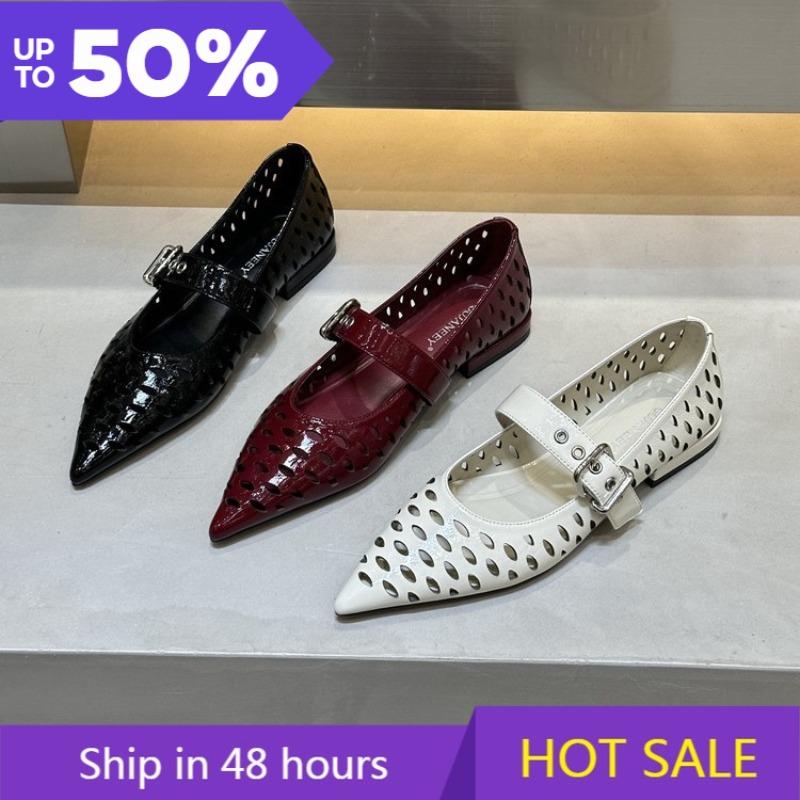 Móda 2025 Léto Nové Lakovaná Kůže Nízké Podpatky Ploché Sandály pro Ženy Módní Špičaté Mělké Ústa Dutý Pásek Knoflík Boty Mary Jane