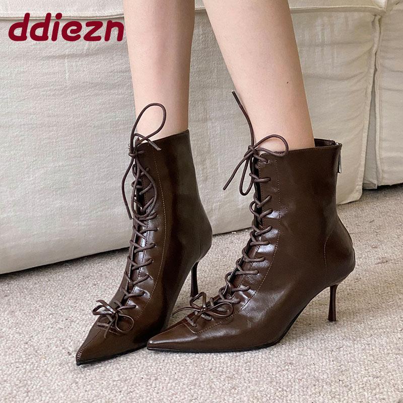Módní dámské kotníkové boty s špičatou špičkou a tenkým podpatkem, módní šněrovací moderní dámské krátké boty, dámské lodičky