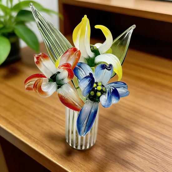Dodajte každému prostoru nádech elegance a barvy s těmito nádhernými skleněnými květinami. Každá mini květina je vyrobena z tlustého a odolného skla a pyšní se zářivými odstíny, které vytvářejí romantickou a veselou atmosféru.. Tyto robustní mini skleněné kytice, ideální pro kutilské tvoření, představují okouzlující dekoraci pro váš domov, kancelář, prostírání, večírky, svatby, kavárny nebo dokonce květinové aranžmá do auta..