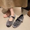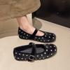 Fashion Cool Gold Rivets Design Ballet Flats Women Faux Suede Belt Metal Buckle Low Heel Women Shoes Non-slip Soft Sole Mary Jane Shoes