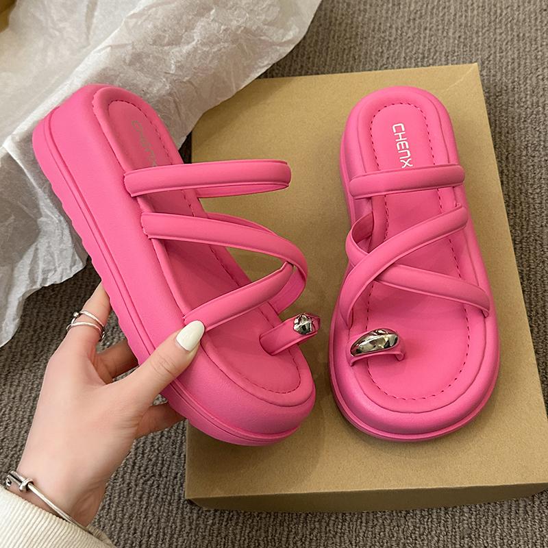 Fashion Female Sandal Comfort Shoes for Women With Heel Cross 2025 Summer Muffins shoe Girls Beige New Velvet Thick Low Beach Fash