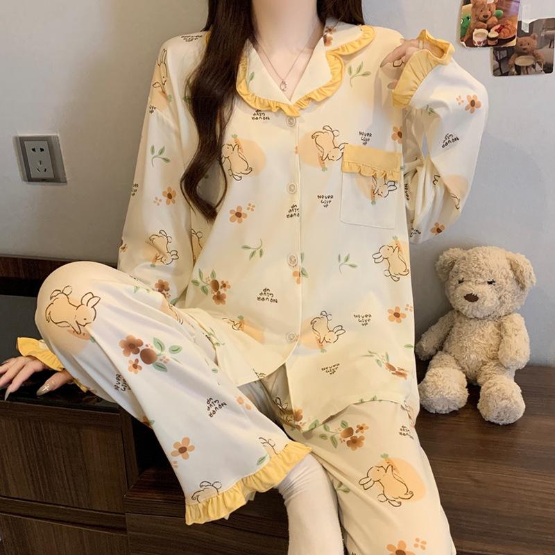 Imitation cotton ruffle leaf edge pastoral cute rabbit girl pajamas autumn long-sleeved cartoon soft glutinous loungewear two-piece set