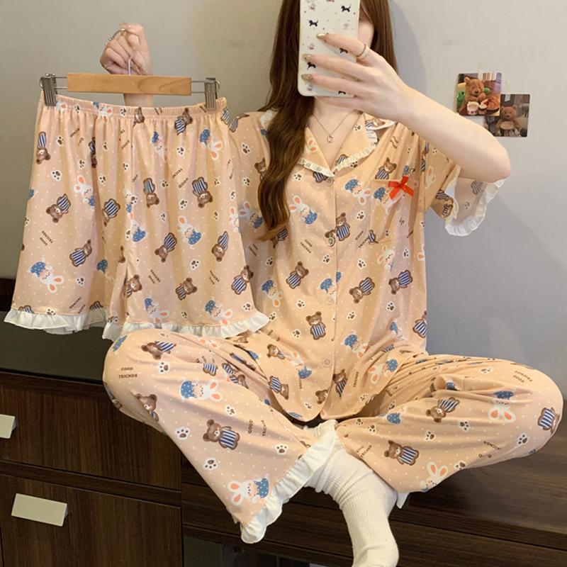 Lotus leaf edge cute cartoon short-sleeved pajamas women's summer new thin comfortable loungewear three-piece set