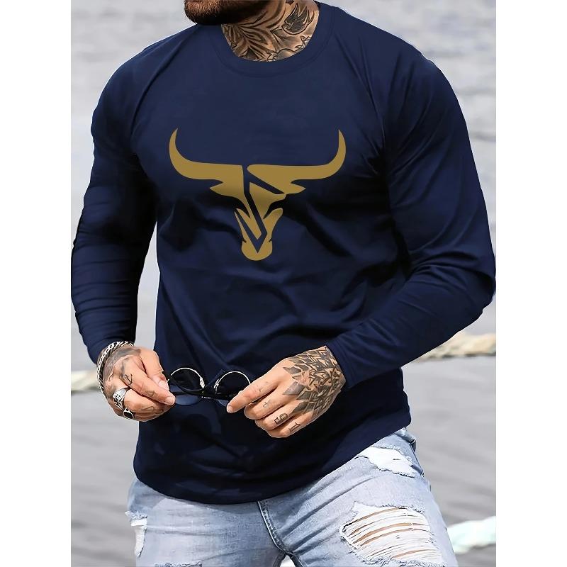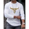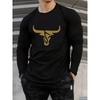 Men's Autumn Winter Loose Fit Plus Size Comfortable Casual Sports Bull Pattern Printed Round Neck Fashion Long Sleeved T-shirt