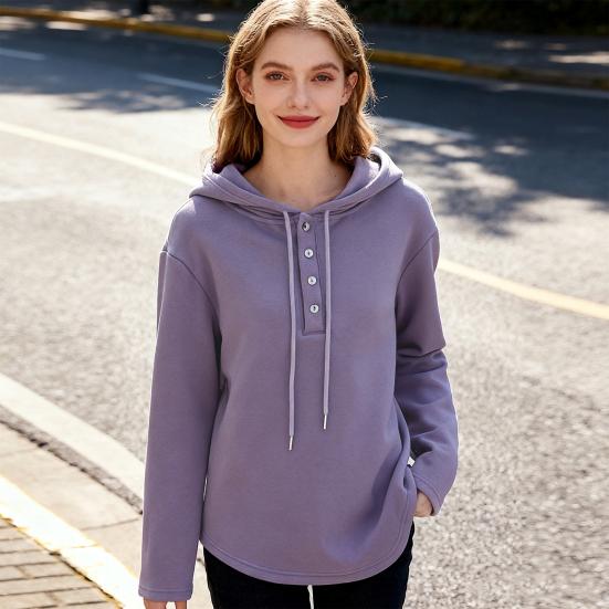 Zůstaňte v teple a stylová v této dámské mikině s kapucí vyrobené z měkkého a prodyšného polyester spandexu.. Volný střih poskytuje pohodlí bez omezení, zatímco nastavitelná kapuce se stahovací šňůrkou dodává osobní dotek..