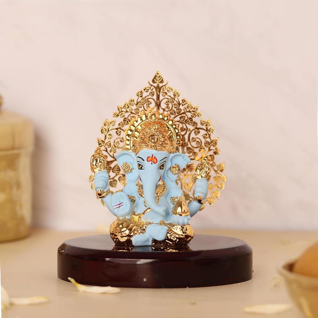 Gold Plated Kalpavrikshya Tree Ganesh Idol Ganpati Murti for Car Dashboard, Office Desk, Hindu God Gift & Home Decor - Resin (Blue) - 4 Inches - Pack of 1