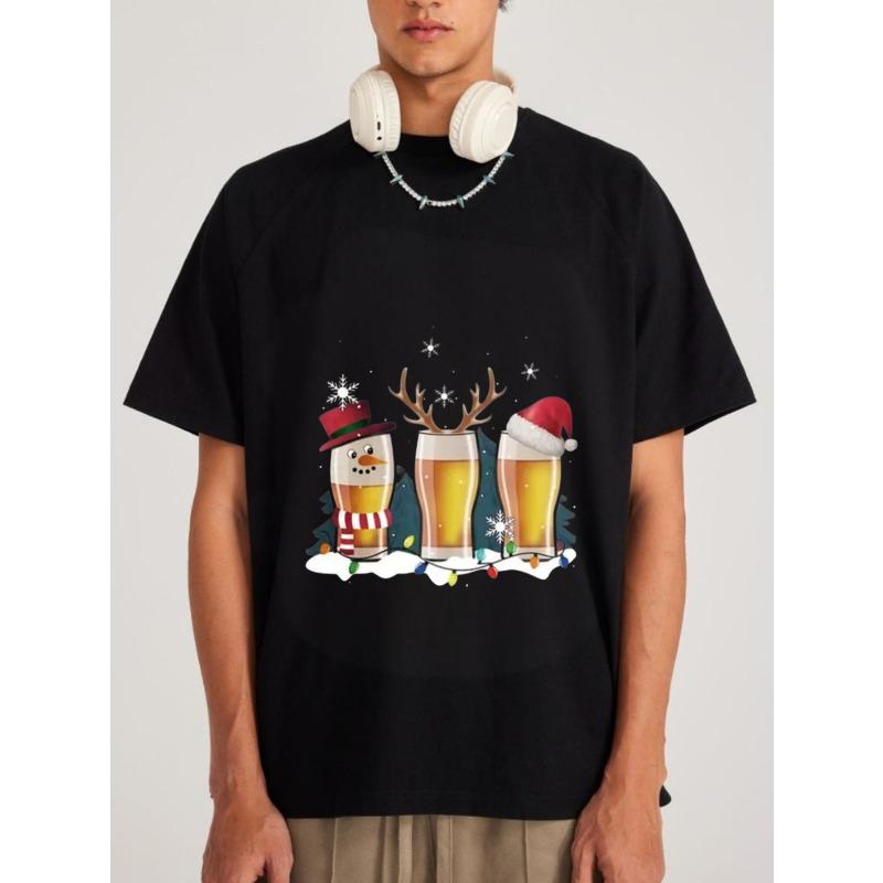 Vánoční tričko se sklenicí na pivo Bílý sněhulák Jelen a Santova čepice Pivní sklenice s vánočními světýlky a sněhovými vločkami Oblečení na sváteční párty