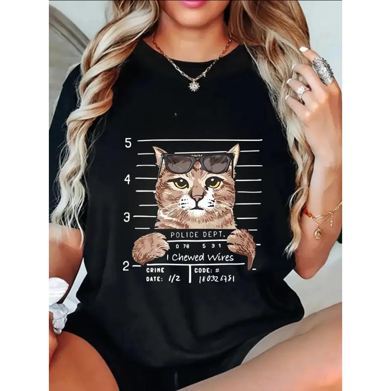 Oversize Women's Short-Sleeve T-Shirt with Sunglasses-Wearing Cat Mugshot Print and "I chewed wires" Text
