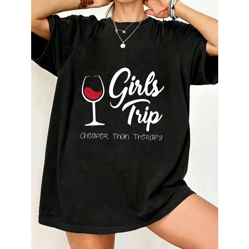 Girls Trip T Shirt Black Wine Glass And Text Cheaper Than Therapy Design For Women Casual Outfits Party Wear Vacation Clothes