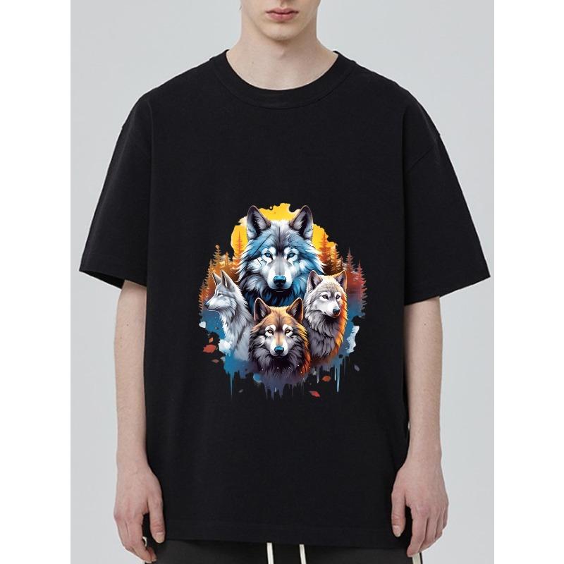 Wolf Print T Shirt Black Four Wolves and Autumn Forest Design for Casual Wear