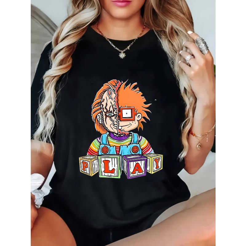 Dámské ležérní tričko Černé potisk Chucky panenka hrací kostky grafické tričko pro každodenní nošení