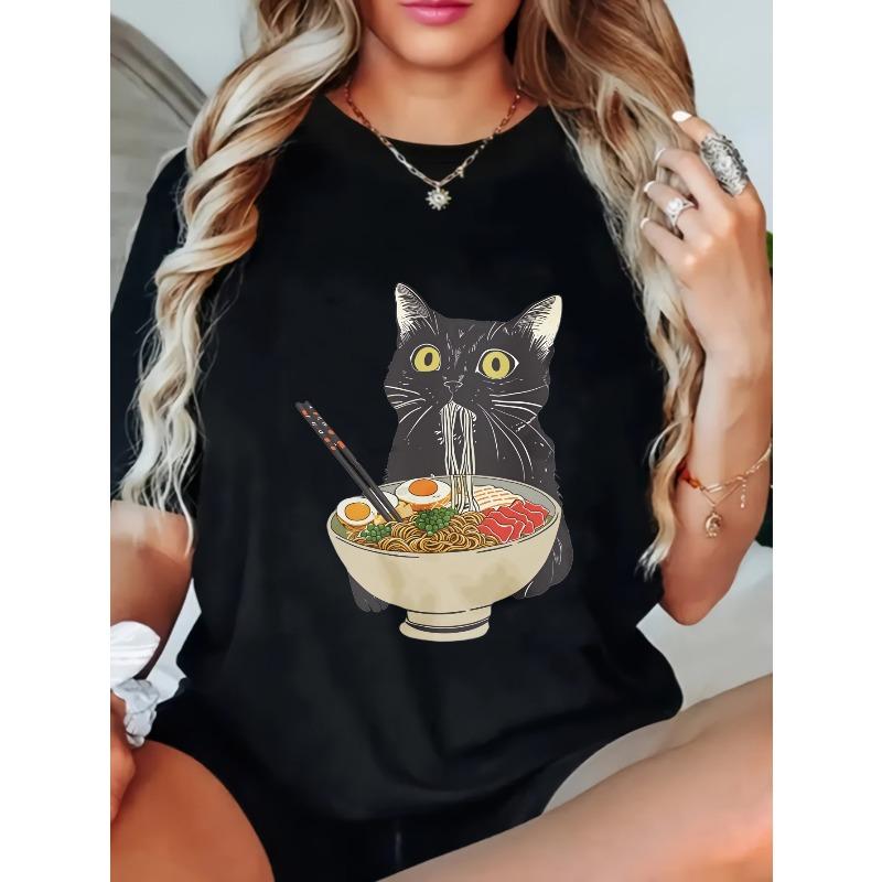 Women Casual T Shirt Black Cat Eating Ramen Noodle Print Loose Fit Top For Daily Wear And Home Comfort