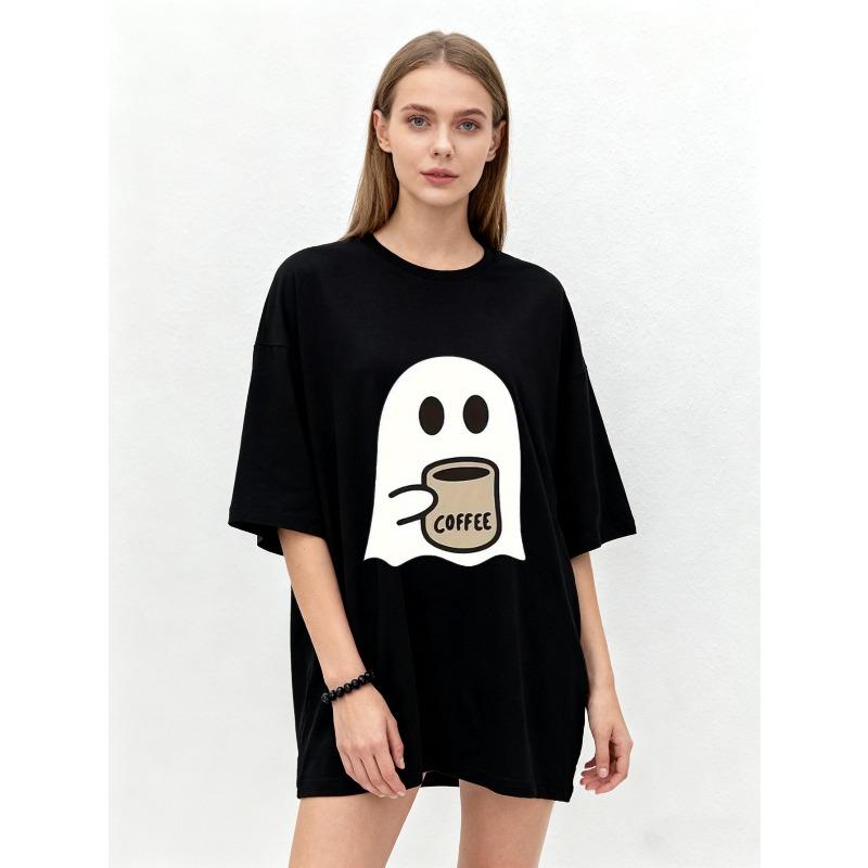 Oversized T Shirt Black Ghost Holding Coffee Cup Print Casual Everyday Wear